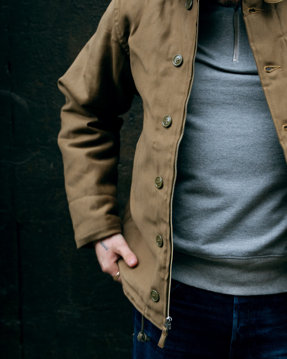 With a shell changed from cotton twill to Bedford cord, the N-1 was now much more water resistant than its predecessor, and with a double-face Alpaca lining replacing the wool, the jacket finally had the insulation it needed to brave the open ocean. Ribbed cuffs were set-in to the sleeves, protecting the usually damage-prone area, and a drawstring was added for a tighter fit and better protection from harsh weather. To finish the piece, a combined zip and buttoned front closure made sure the N-1 was sturdy and protective, making it a workhorse that lasted the entirety of the war.